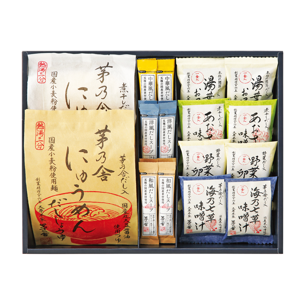 茅乃舎にゅうめんだししょうゆ・茅乃舎にゅうめんだししお(各1食入)、和風だしスープ・洋風だしスープ・中華風だしスープ(各4袋入)、湯葉のお吸い物・あおさの味噌汁・野菜と卵のスープ・海乃七草味噌汁(各1食入×2個)