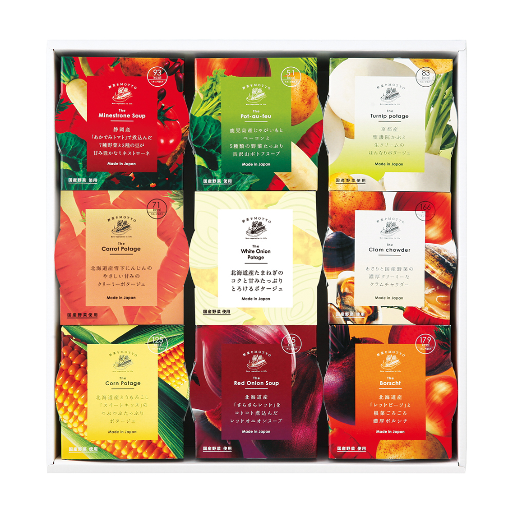 国産野菜使用のスープ9種。1個あたり180kcal以下。常温保存可能でレンジで温めるだけ。冬限定の味も。
