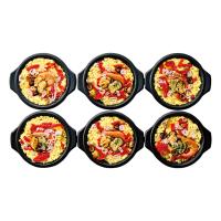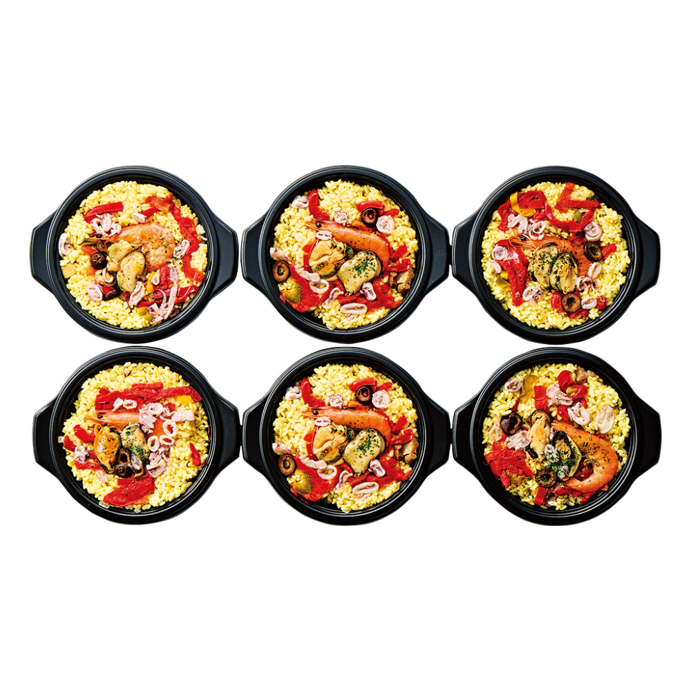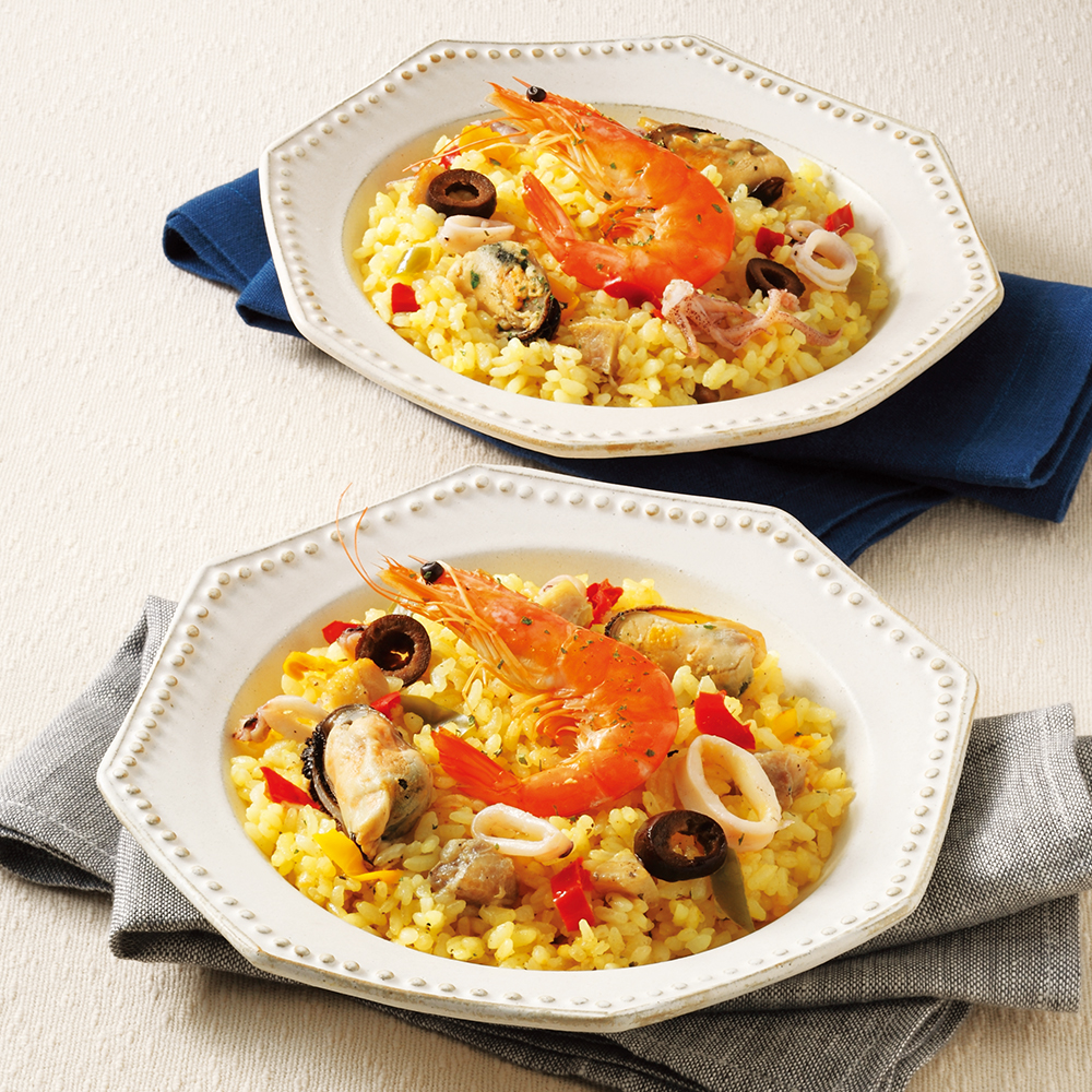 海老、ムール貝、ヤリイカなどの魚介や鶏肉、野菜を使用した具だくさんのパエリアを、電子レンジでお手軽に。