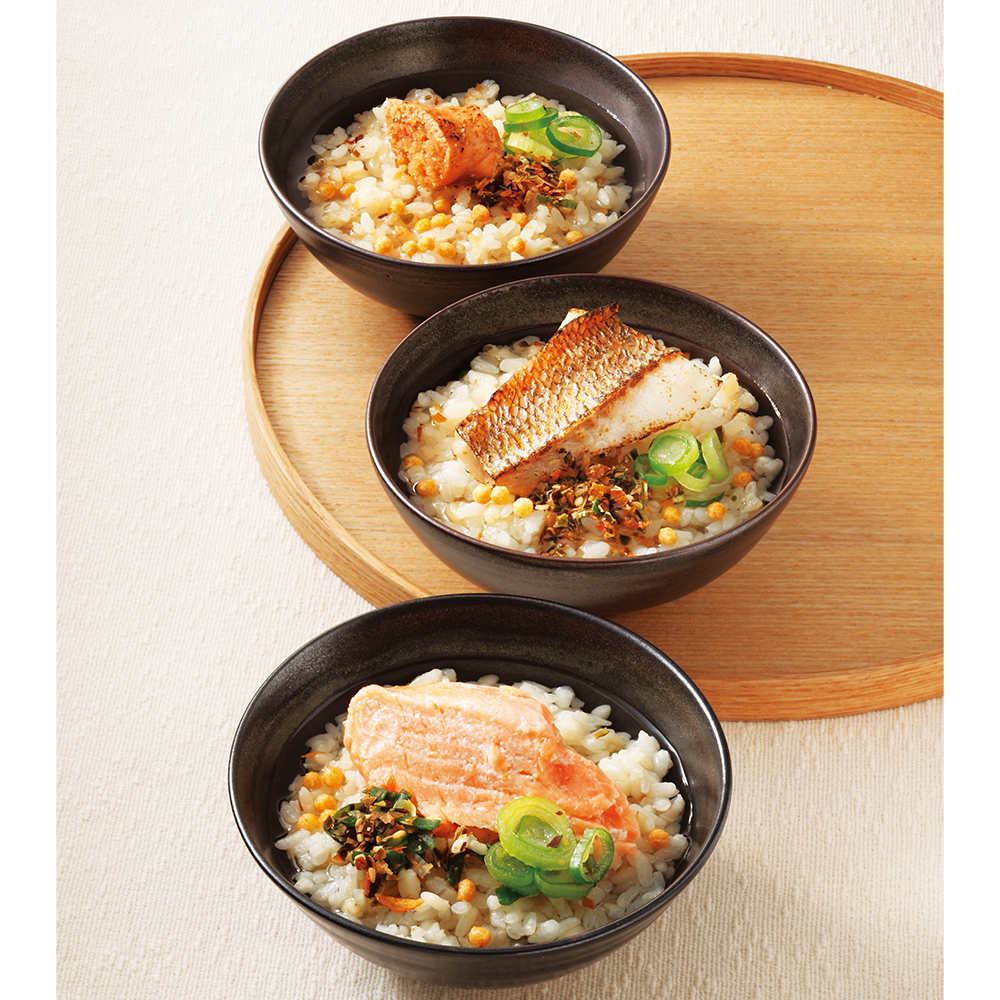 枕崎産本枯節や北海道産利尻昆布を使った、だし茶漬け3種。お湯を注ぐと‘だし’が豊かに香ります。