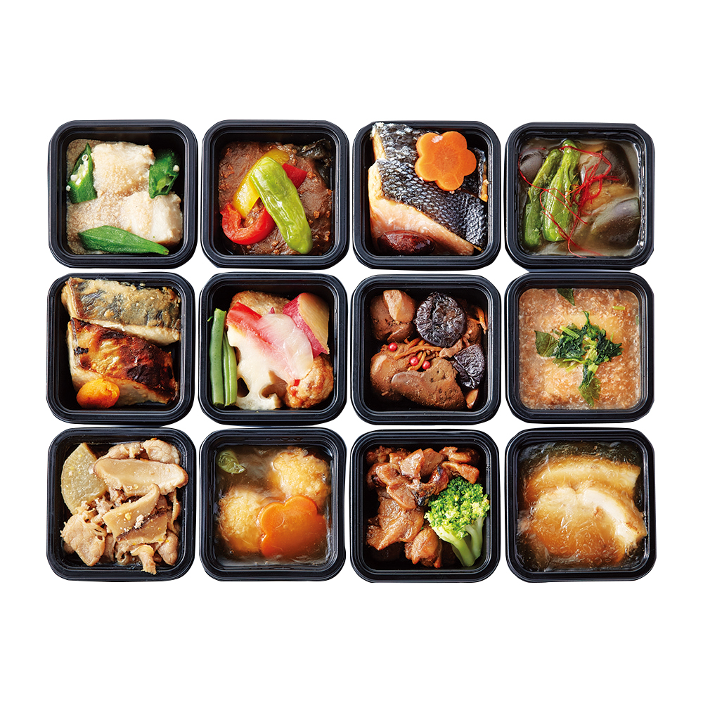 焼物や煮物などバラエティー豊かな個食惣菜12種の詰め合わせ。電子レンジで温めるだけの手軽さ。