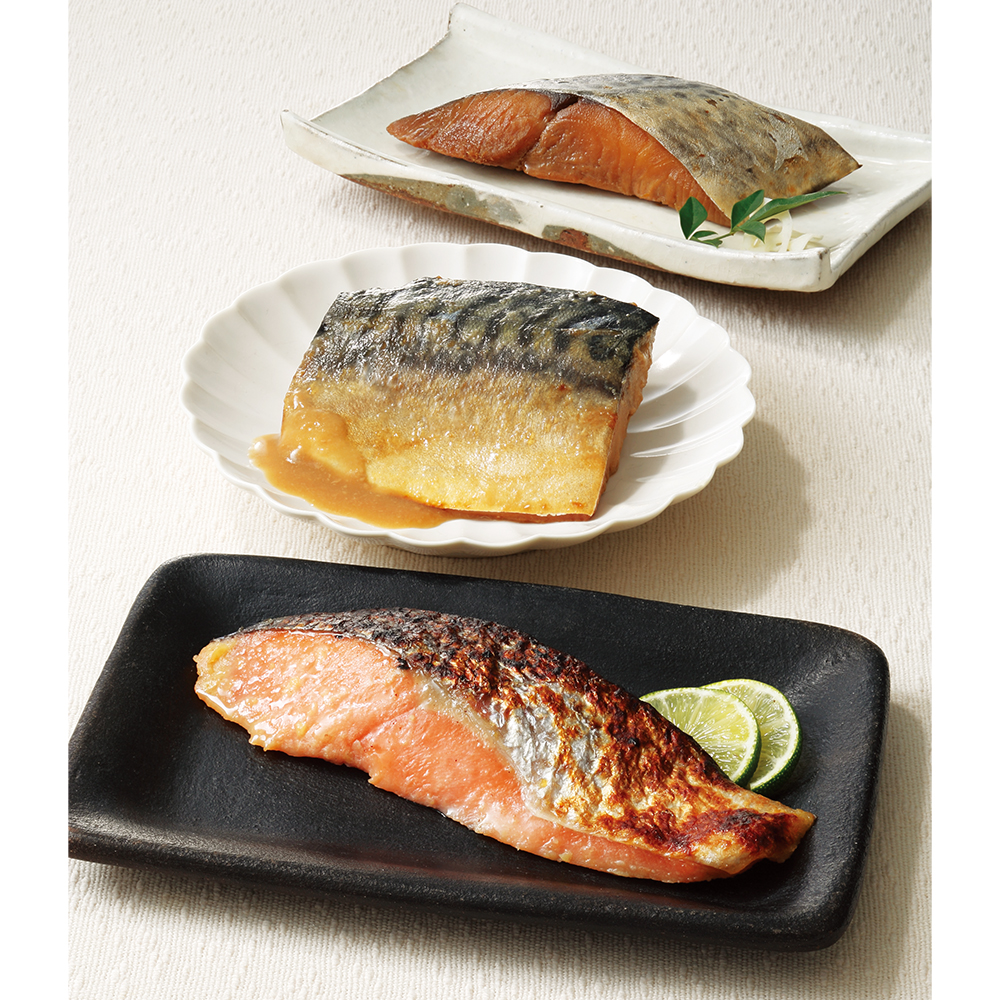 鰆の柚庵焼き60g・鯖の味噌煮70g各3、サーモンの西京焼き60g ※電子レンジ対応 お届け時期:12月25日まで(承り期間:12月19日まで)