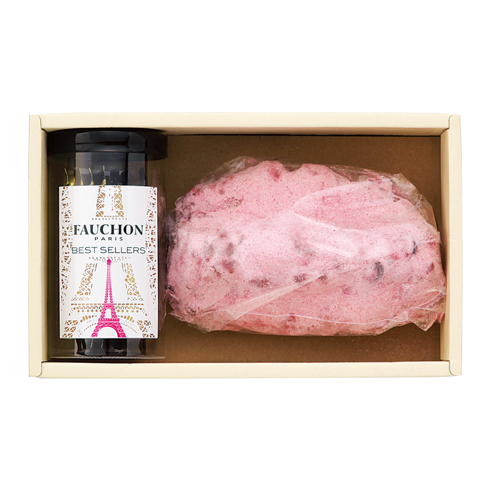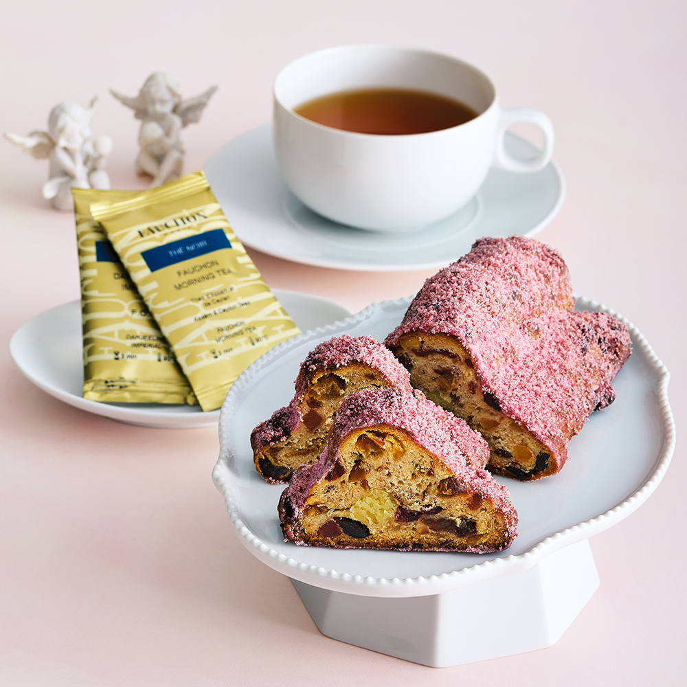 ブランデーに漬け込んだドライフルーツと、ナッツを贅沢に入れ、フランボワーズシュガーで美しく。ティーバッグ4種と。
