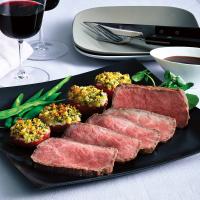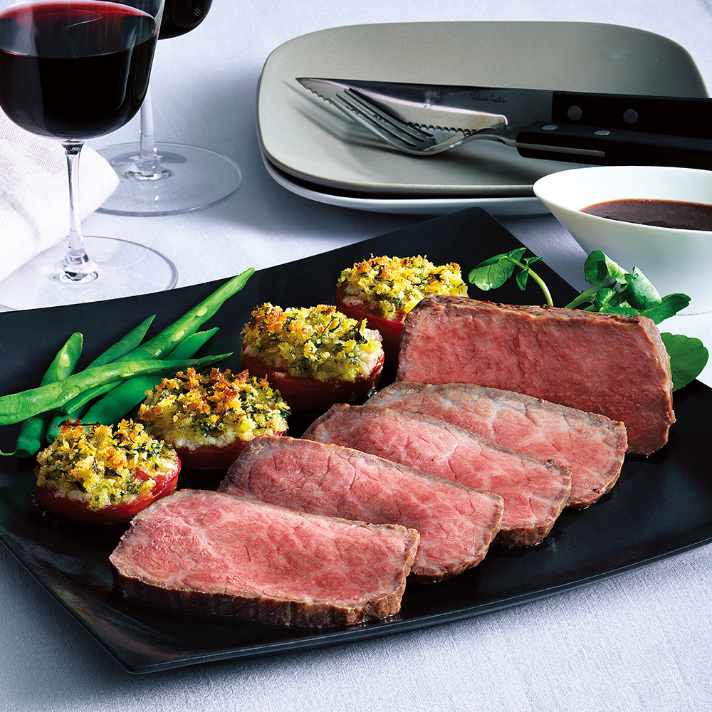 黒毛和牛のもも肉を真空調理製法でローストビーフに。赤ワインソースを添えました。