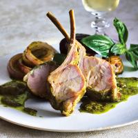 骨付き仔牛肉を香辛料やハーブなどで味付けした後にローストし、バジルソースを加えました。