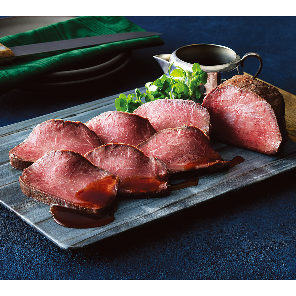 ローストビーフ(モモ)350g、ローストビーフソース60g×3、ローストビーフ(サーロイン)390g 原料原産地:牛肉(オーストラリア・ニュージーランド・ウルグアイほか)