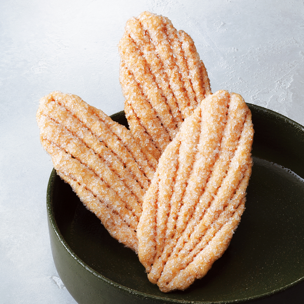 バターと生地を幾層にも重ねて木の葉の形に。サクサクの生地とザラメ糖の食感が人気です。
