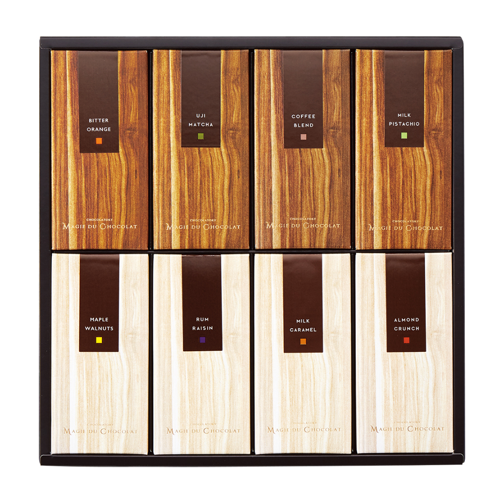 マジドカカオ(アーモンドクランチ、ミルクピスターシュ、コーヒーブレンド、ミルクキャラメル、ラムレーズン、宇治抹茶、メープルウォルナッツ、ビターオレンジ) お届け時期:11月1日から