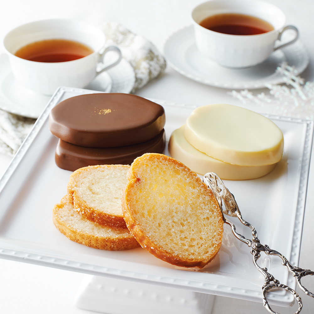 香ばしいフランスパンと上質なバターを使用。ホワイトチョコレートやミルクチョコレートをかけたガトーラスクなど3種を。