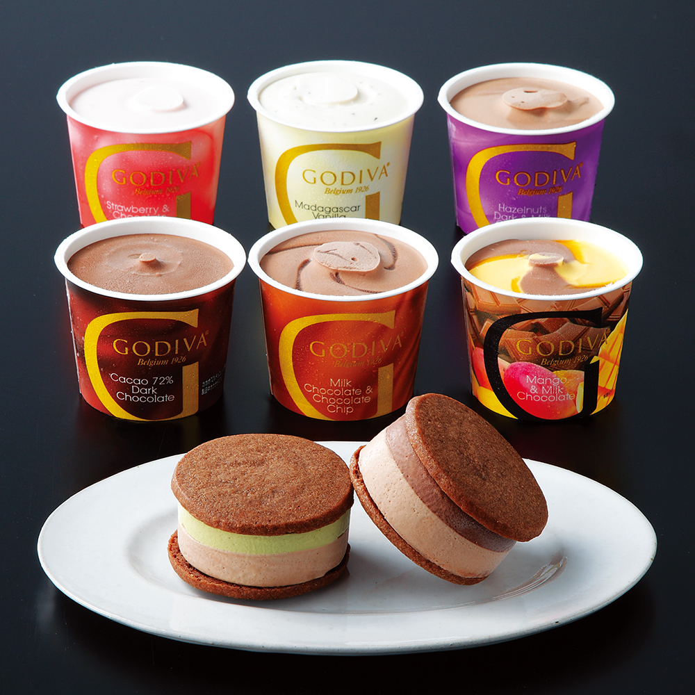 カップアイス6種(マンゴー&ミルクチョコレート、マダガスカルバニラ、ストロベリー&チョコレートチップ、ヘーゼルナッツ ダーク&ミルクチョコレート、カカオ72% ダークチョコレート、ミルクチョコレート&チョコレートチップ)、サンドアイス2種 お届け時期:11月6日から12月25日(承り期間:12月18日まで)