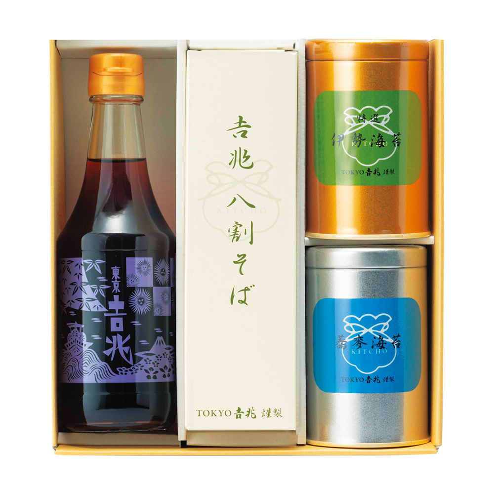 国産そば粉を使った八割そばと、三重県産伊勢のり、名店のだしを詰め合わせました。