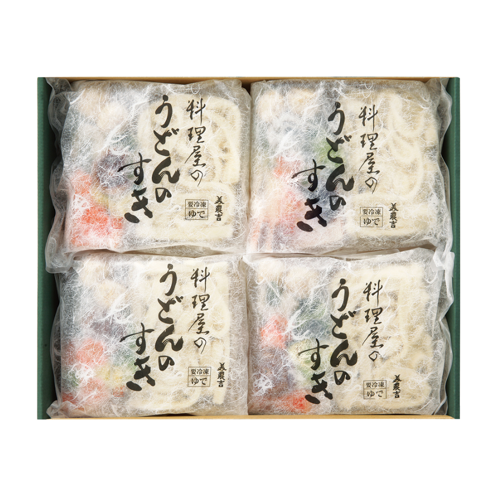 京料理の老舗による鍋料理。美濃吉特製の太うどんと具材、自慢のだしを1食ずつパックにしました。