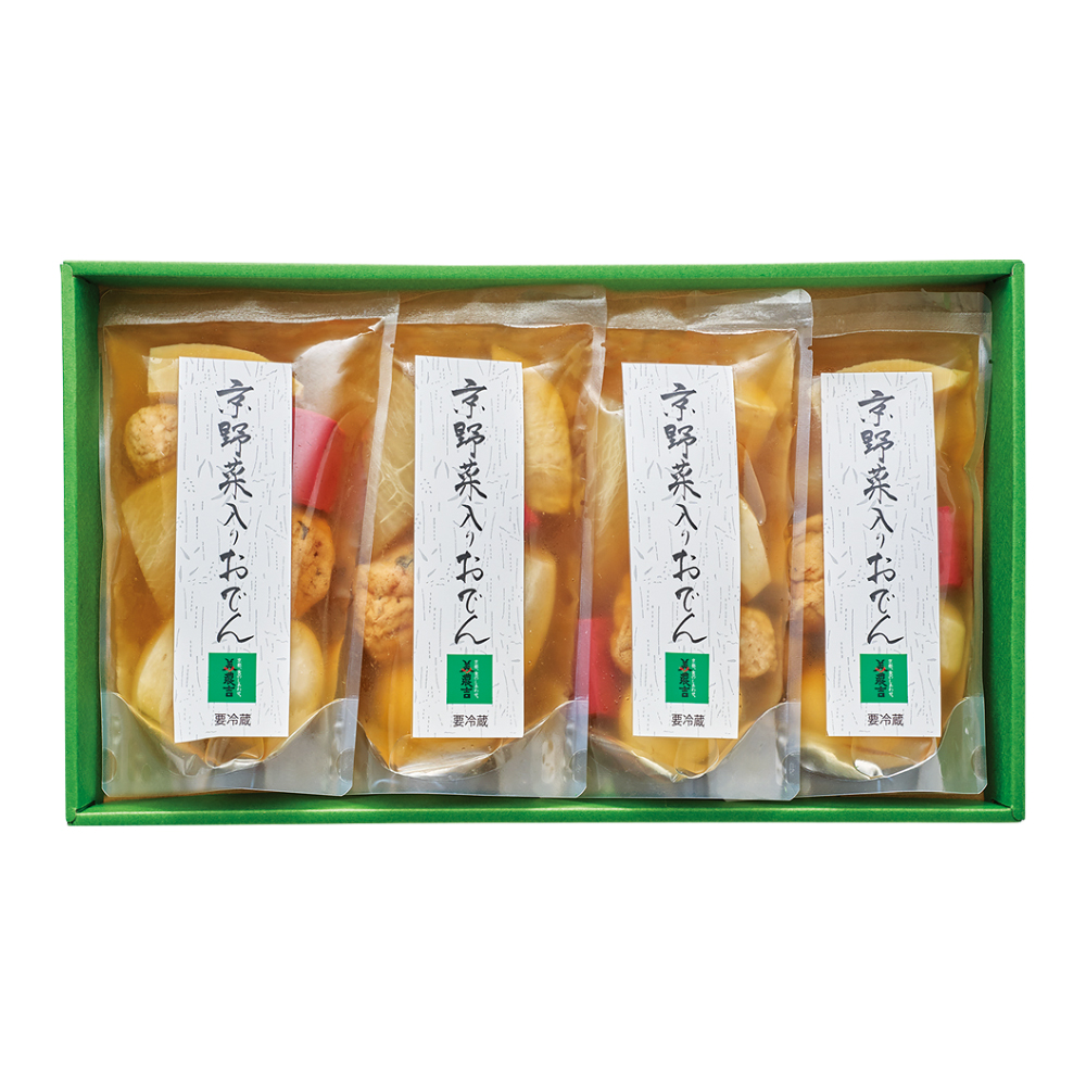 京野菜入りのおでん(聖護院大根、赤こんにゃく、京筍、里芋、たまご、ひろうす、つくね団子)×4 お届け時期:12月4日から12月25日(承り期間:12月19日まで)