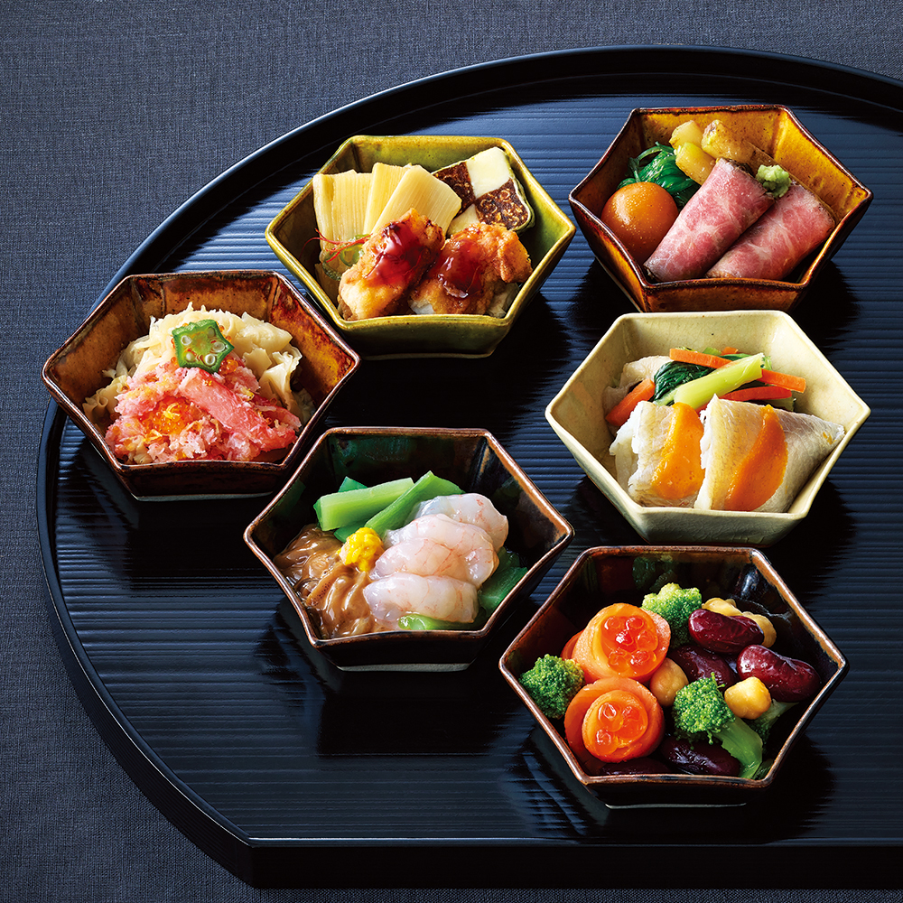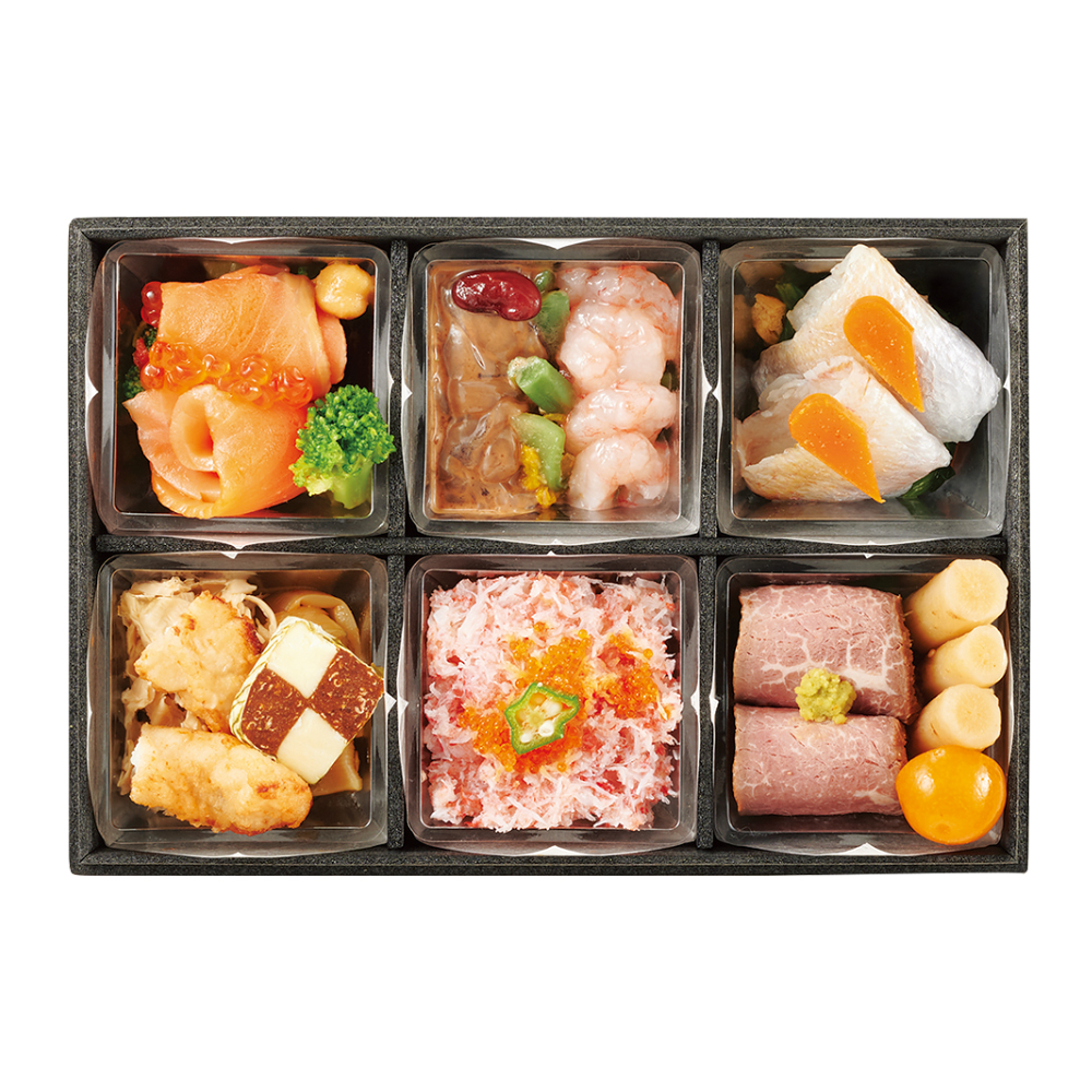 能登牛ローストビーフわさび風味19g、ふくいサーモン彩サラダ添え52g、いかの赤作りと甘海老塩辛小菊ちらし84g、ふぐの唐揚げ湯葉胡麻和え添え38g、小鯛の笹漬けからせんじゅと青菜添え44g、ほか1種計6点