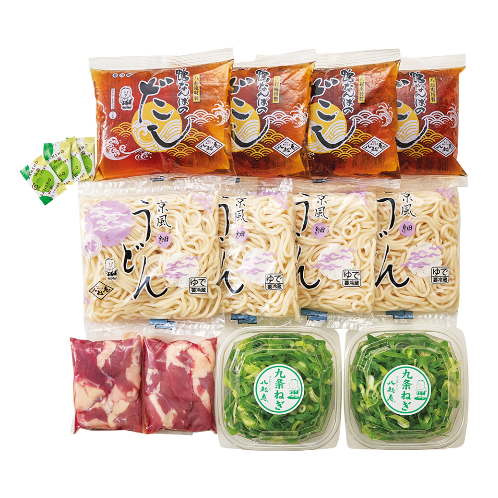 うどん200g×4、だし330g×4、国内産合鴨肉110g×2、ねぎ80g×2、山椒4袋 お届け時期:12月17日まで(承り期間:12月11日まで)