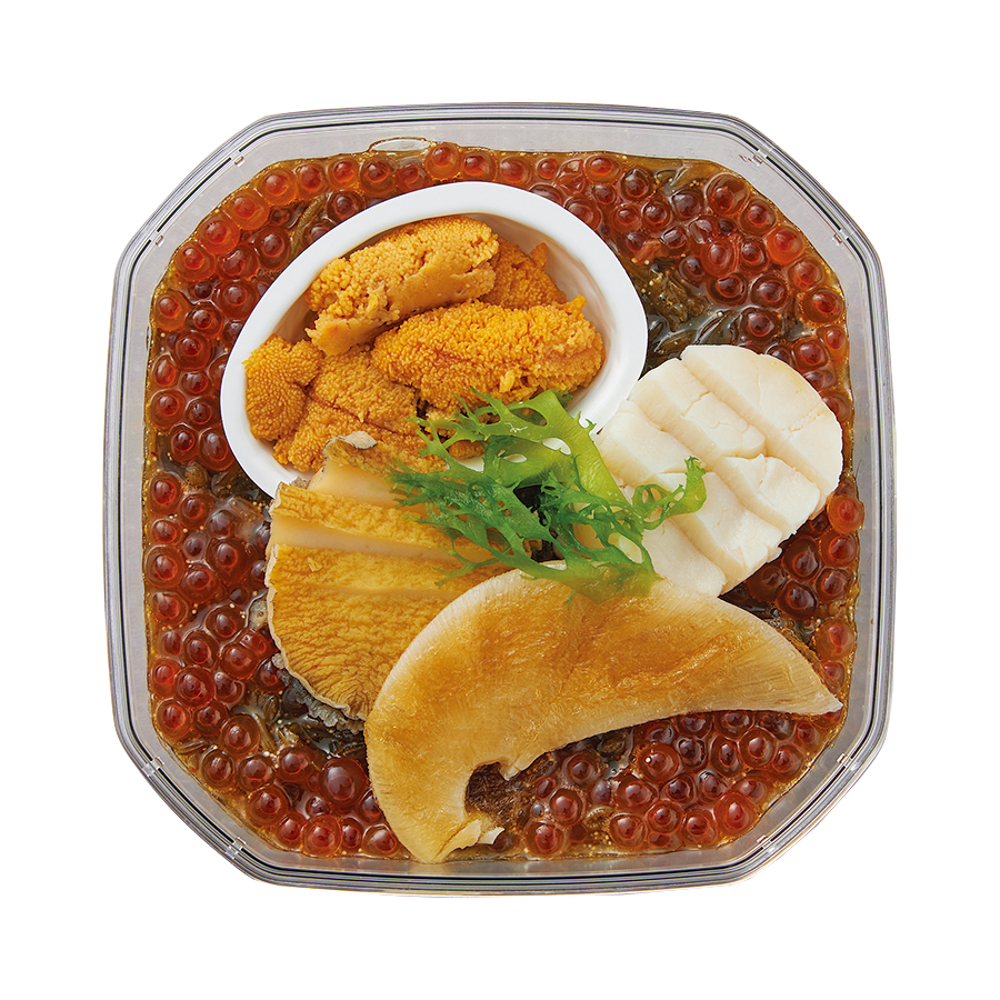 中村家が目利きをした三陸産のうに・あわび・ほたてを、国産のいくら・ふかひれとともに海宝漬に。