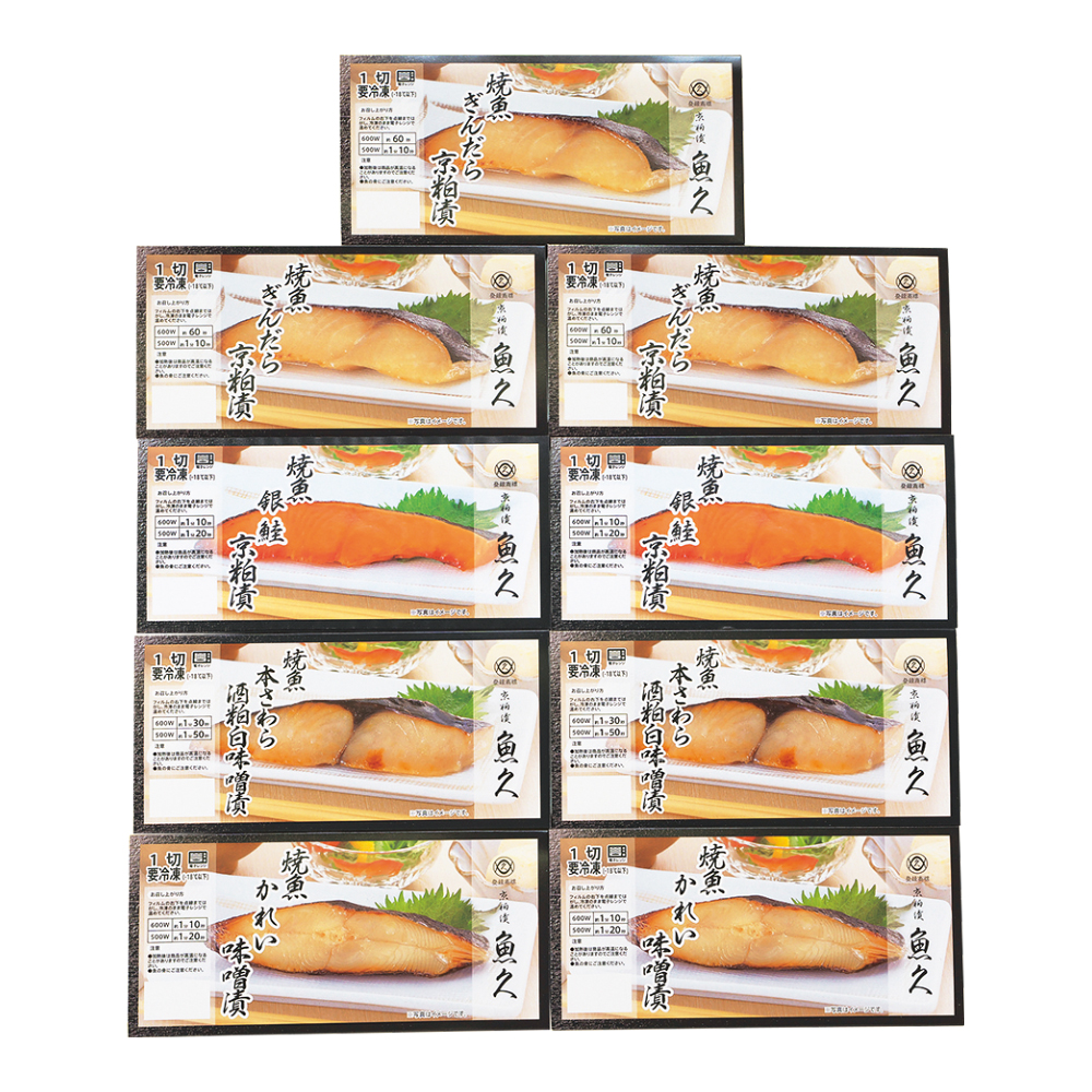 ぎんだら京粕漬焼55g×3、銀鮭京粕漬焼・本さわら酒粕白味噌漬焼各55g×2、かれい味噌漬焼50g×2※電子レンジ対応