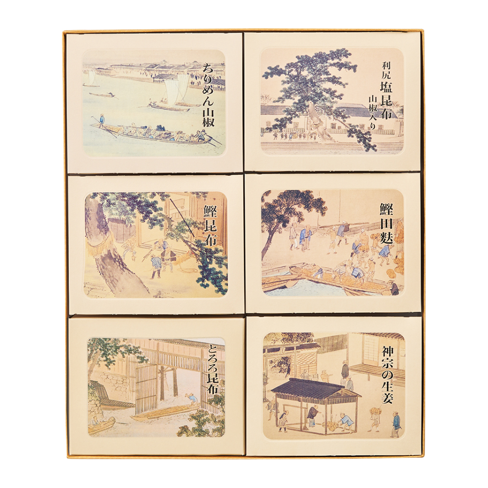 利尻塩昆布山椒入り・神宗の生姜各110g、ちりめん山椒・鰹田麩各70g、鰹昆布80g、とろろ昆布40g