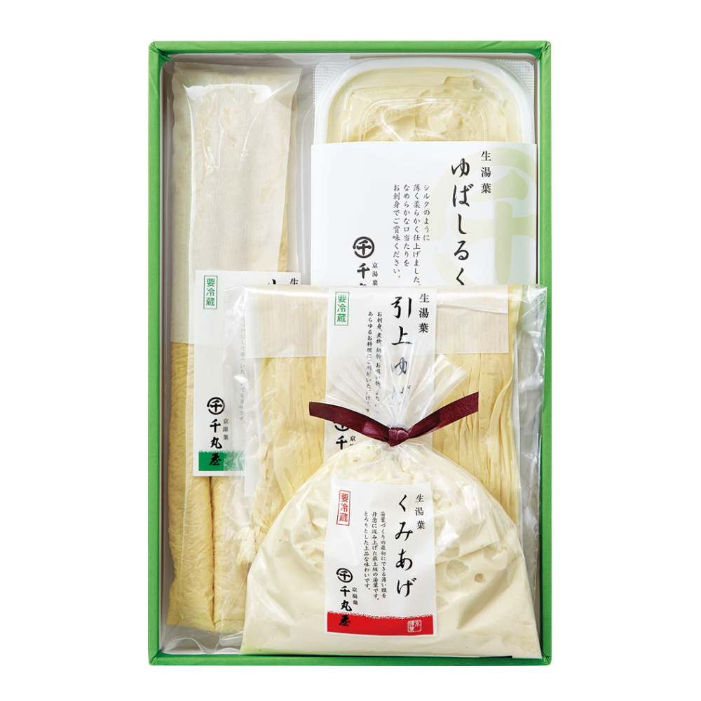 引上ゆば5枚、生小巻ゆば3本、くみあげゆば150g、ゆばしるく3枚