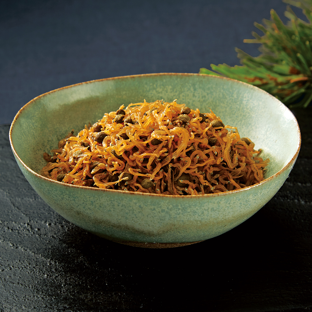 チリメンジャコと実山椒を炊いた京の味「チリメン山椒」。サラサラの食感とピリッときいた山椒の風味をお楽しみください。