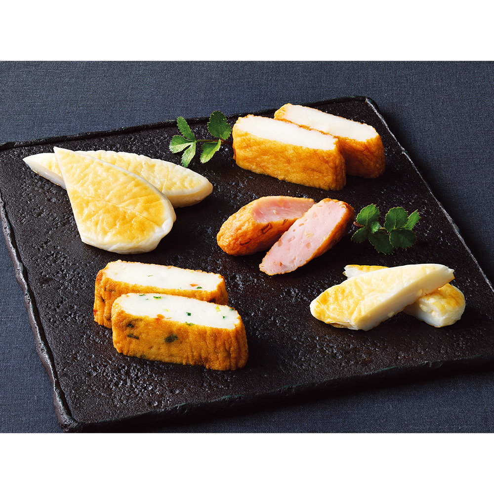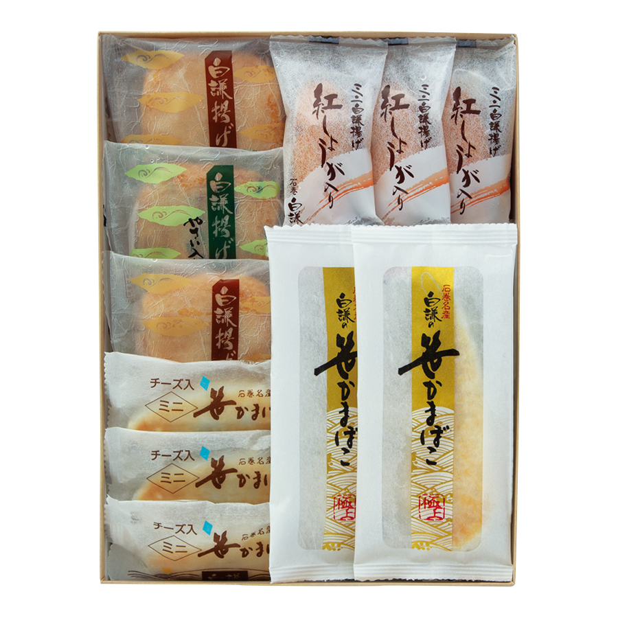 極上笹かまぼこ・チーズ入りミニ笹かまぼこ各5枚、白謙揚げ・野菜揚げ各3枚、ミニ紅生姜揚げ6枚
