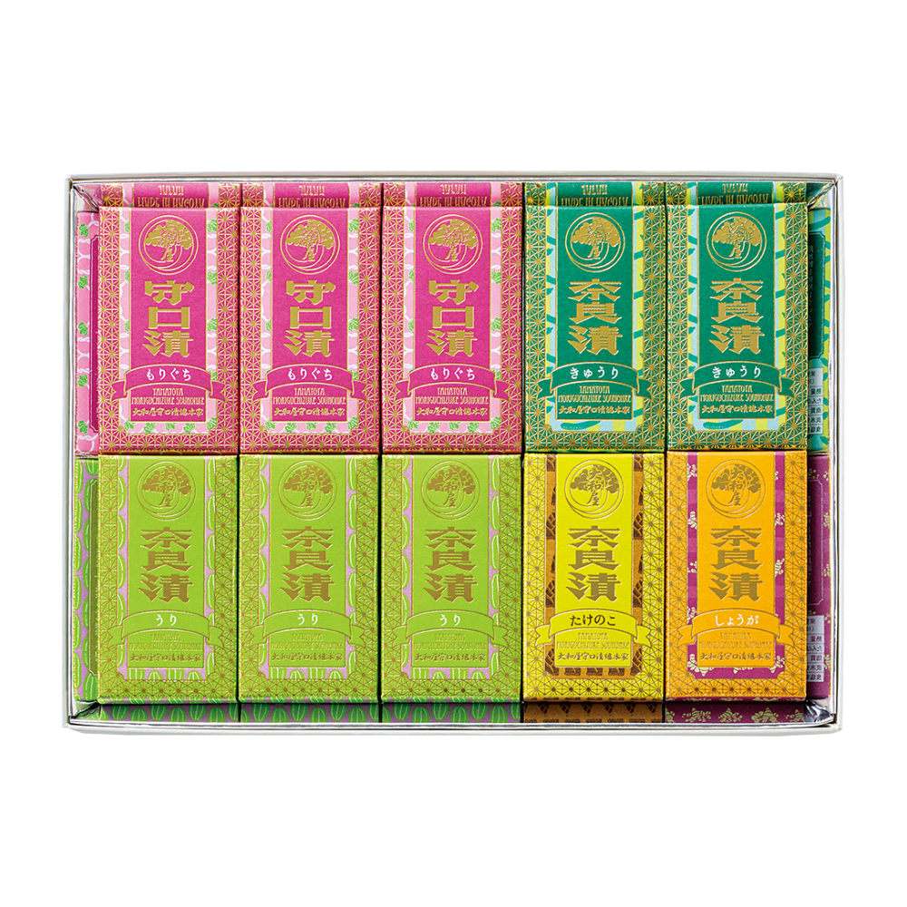 守口漬・瓜奈良漬各17g×3、胡瓜奈良漬17g×2、竹の子奈良漬15g、生姜奈良漬19g