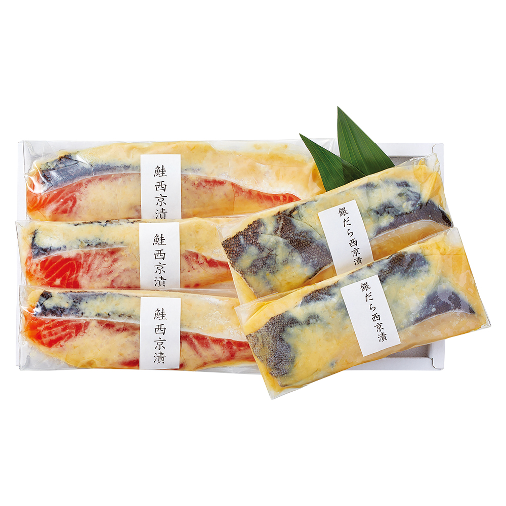鮭西京漬×3、銀だら西京漬×2 原料原産地:鮭(ノルウェー)
