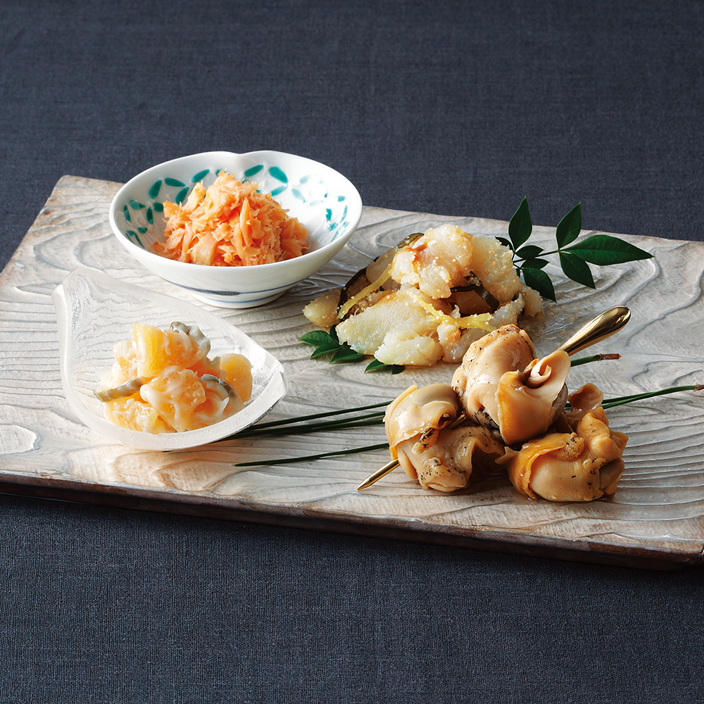 つぶ貝をお酒と醤油で炊いた「つぶ貝の酒香煮」や、風味豊かに仕上げた「鱈の親子漬」など、4種の詰め合わせ。