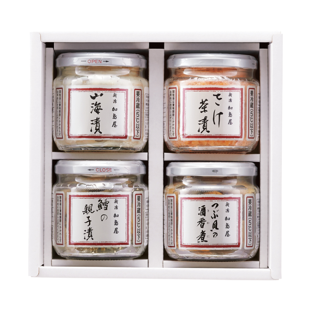 さけ茶漬130g、つぶ貝の酒香煮170g(固形量90g)、山海漬180g、鱈の親子漬160g お届け時期:11月9日から