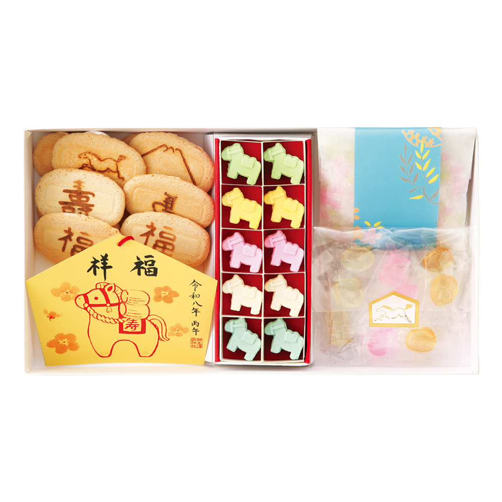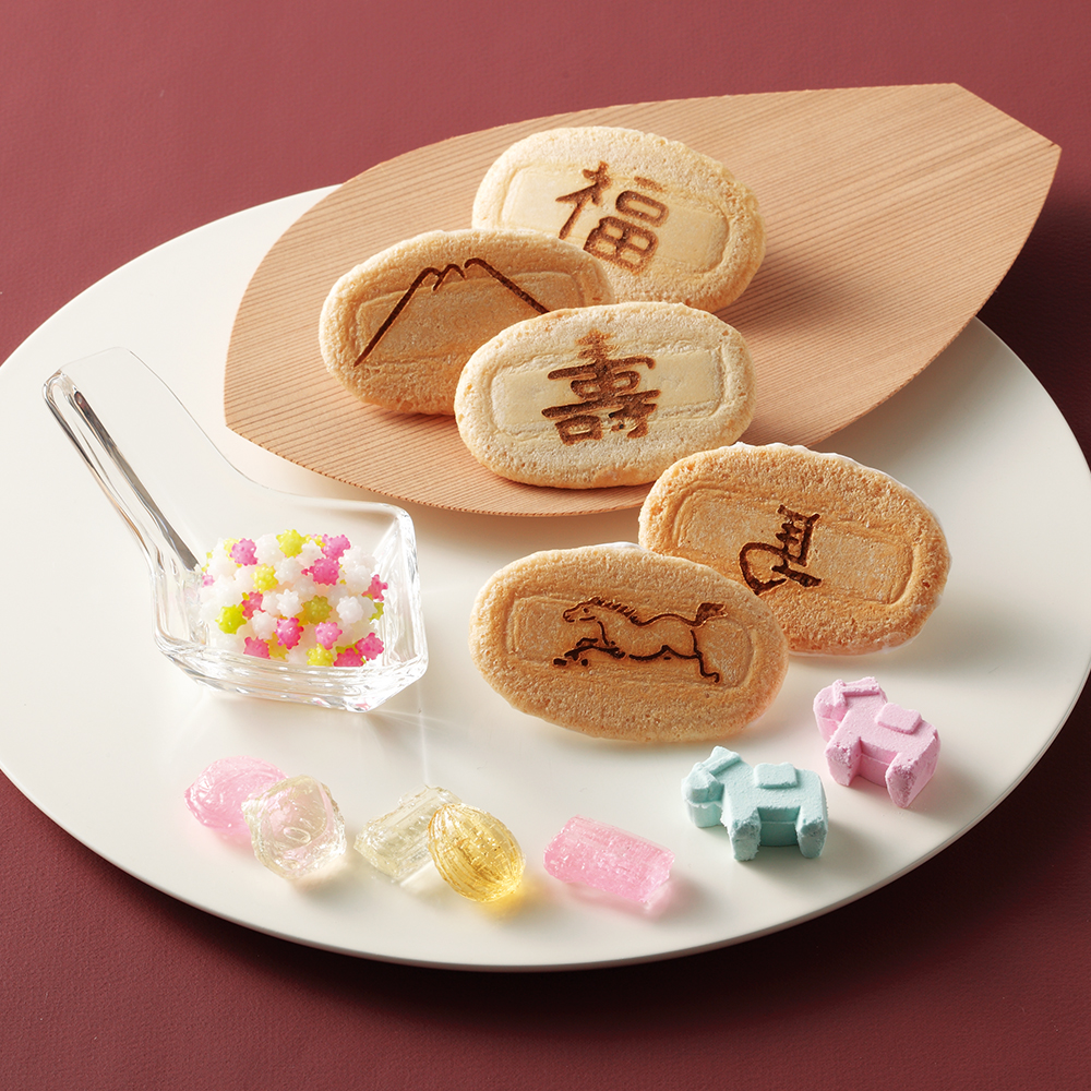 冨久袋(麩焼煎餅)10枚、打物:干支(福午)10個、金平糖45g、昔つくりあめ(桃・べっ甲・白砂糖各3) お届け時期:12月3日から