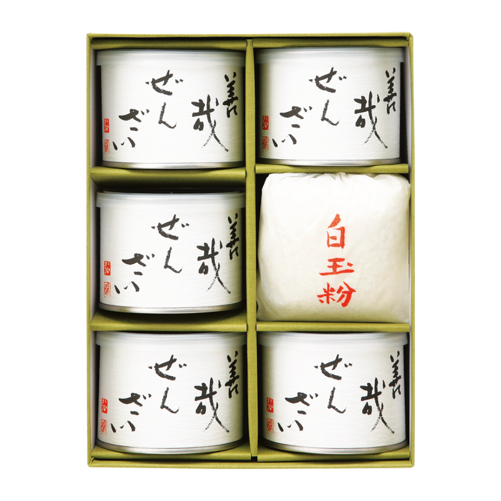 缶入りぜんざい240g×5缶、白玉粉120g×1袋※白玉はできたての風味を味わっていただくため、ご自身で白玉粉からお作りいただきます。
