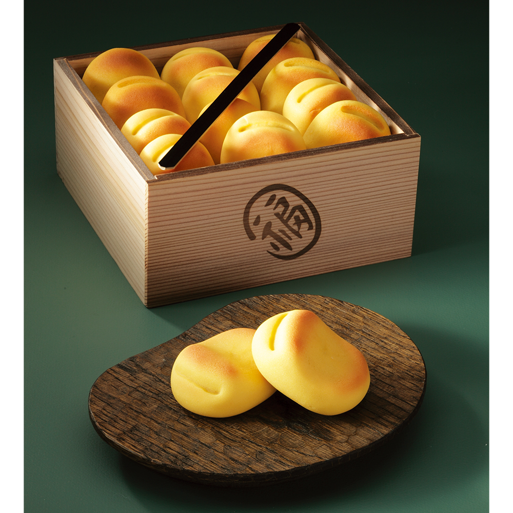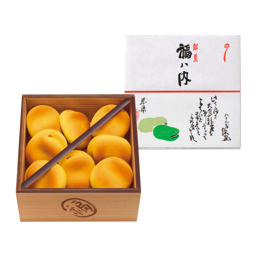 お多福豆をかたどった白餡入りの桃山。「ますます繁盛」の願いを込めた桝の形の木箱入りです。