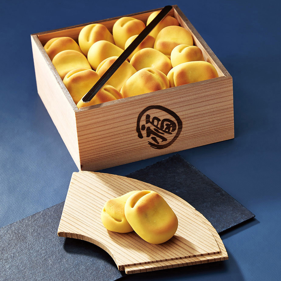 お多福豆をかたどった白餡入りの桃山。「ますます繁盛」の願いを込めた桝の形の木箱入りです。