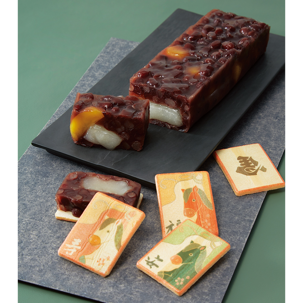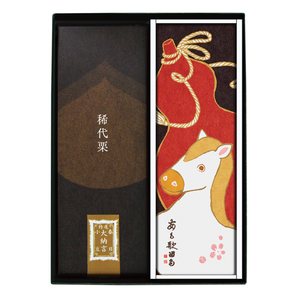 国産の大粒栗をちりばめた「稀代栗」を、干支柄の最中種「あも歌留多」に挟んでお召しあがりください。