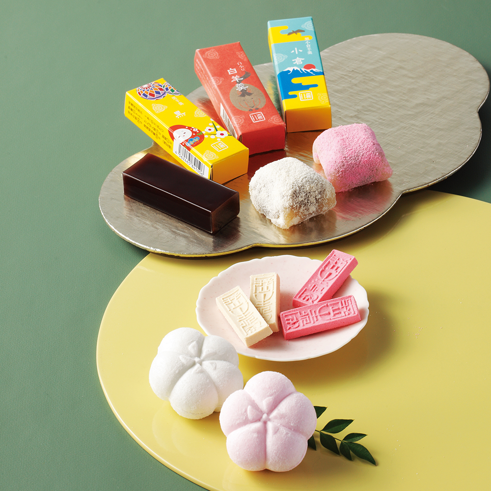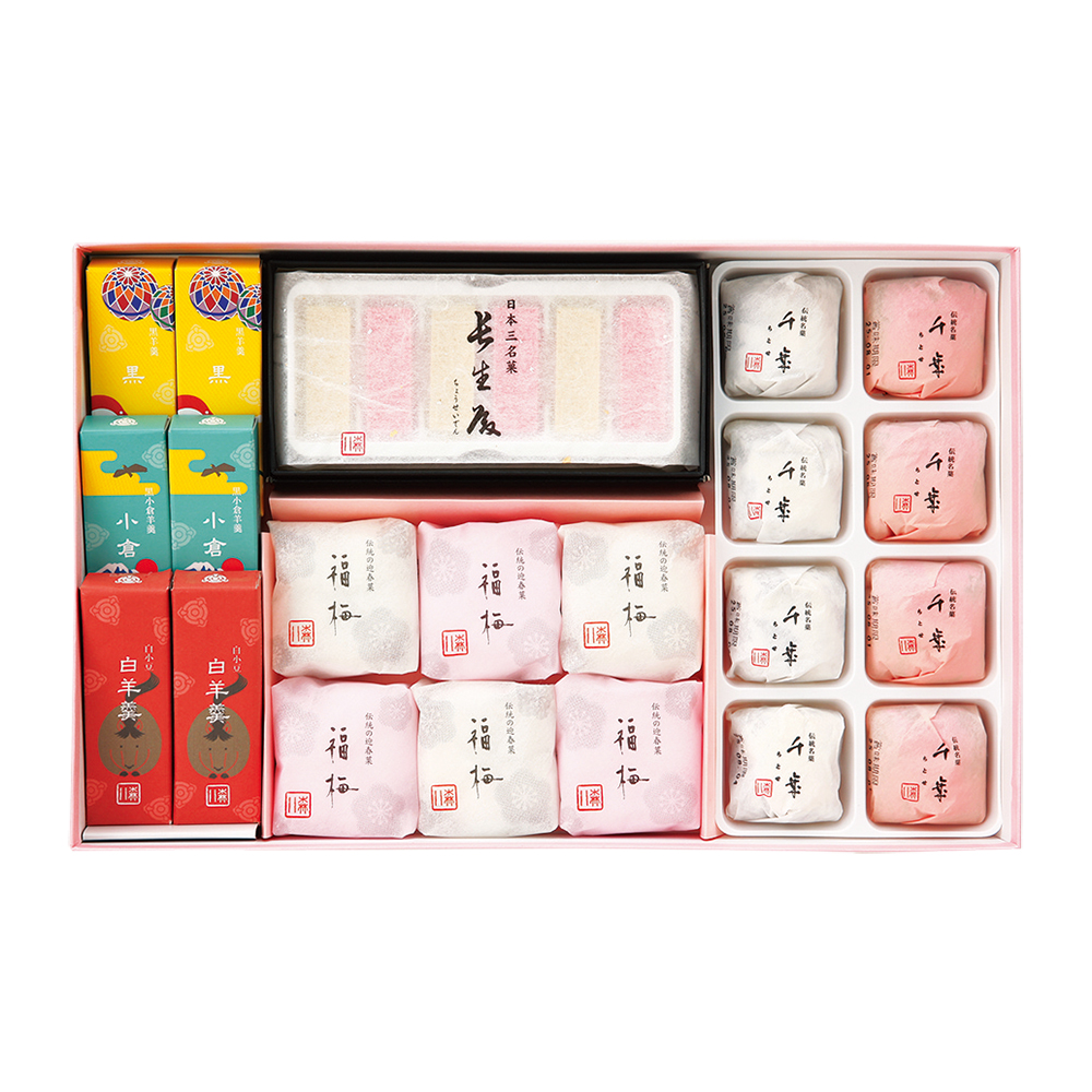 小型羊羹「粋」迎春パッケージ×6(白・黒・小倉各2)、長生殿(小墨)12入(赤・白各6)、千歳×8(赤・白各4)、福梅×6(赤・白各3)