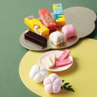 森八の代表銘菓「長生殿」と迎春パッケージの「小型羊羹」など、華やかな詰め合わせ。