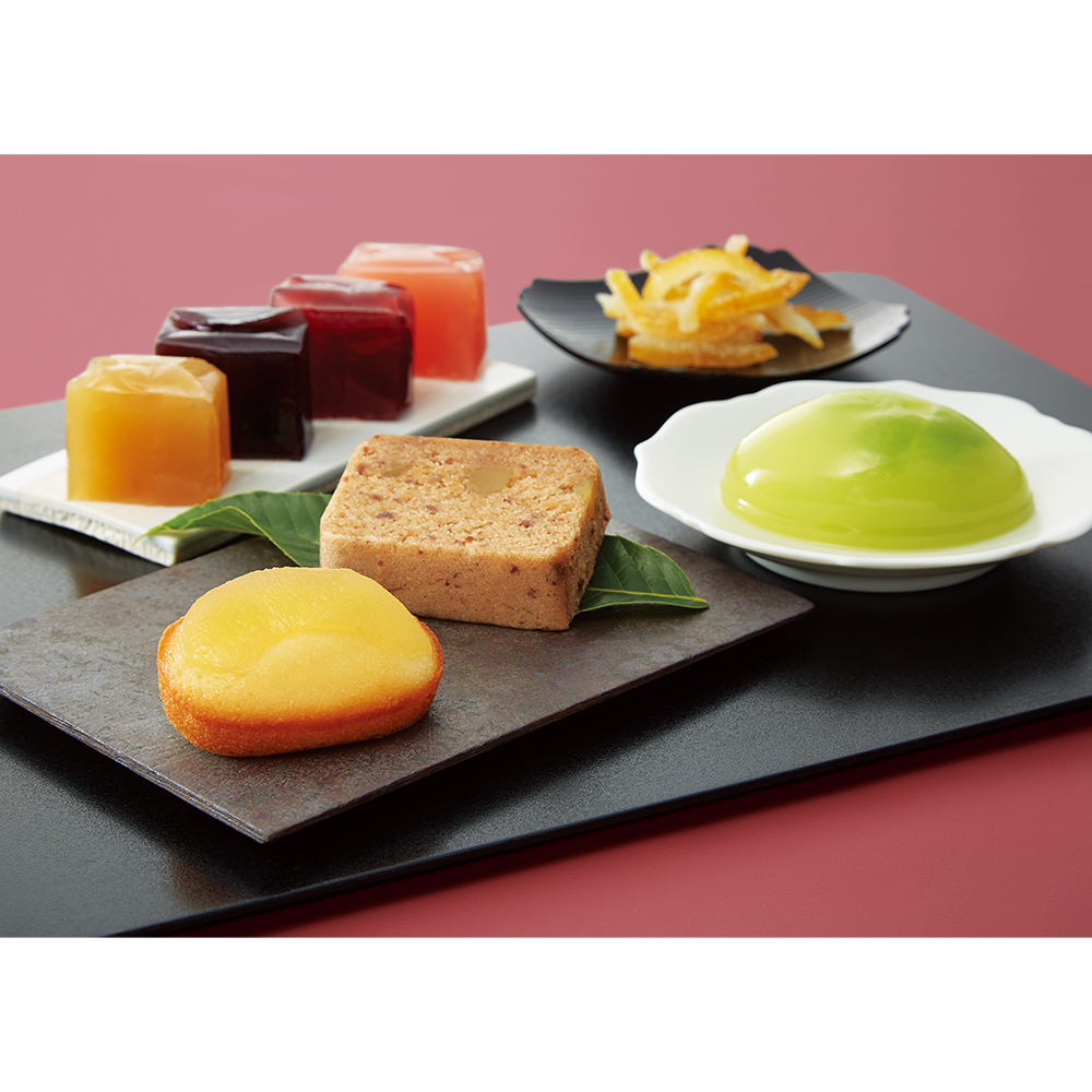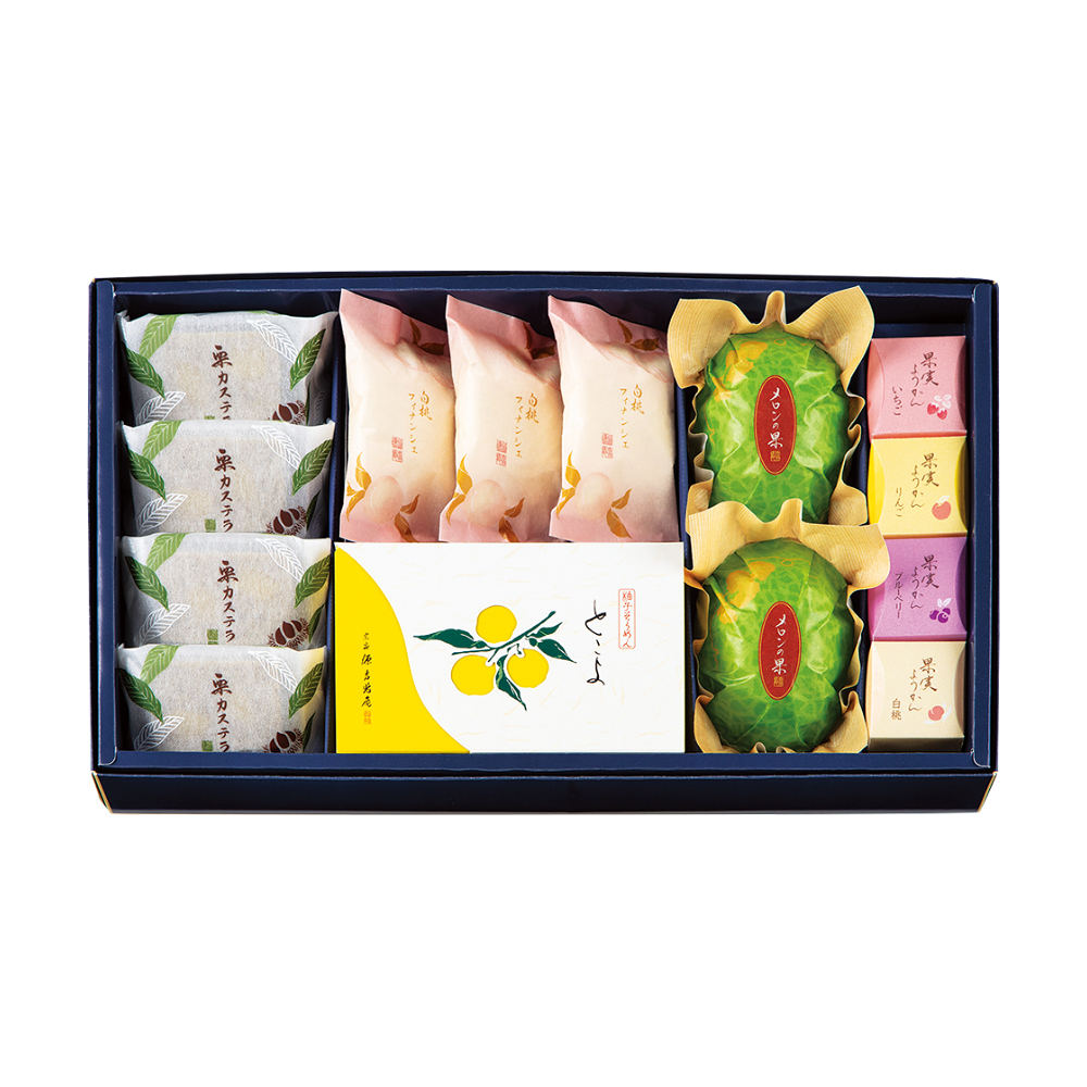 きざみ栗を散りばめ、しっとり蒸しあげた「栗カステラ」をはじめ、果実を使った多彩なお菓子の詰め合わせ。