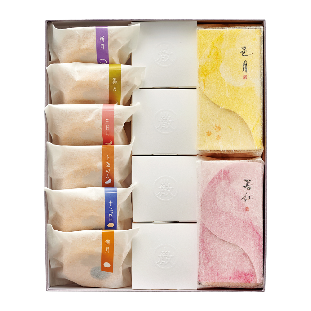 若紅、邑月、最中「つきみてよ」(新月・繊月・三日月・上弦・十三夜・満月)、焼菓子(弘厳月餅・吟月茶通・六和敬・喫菓去)