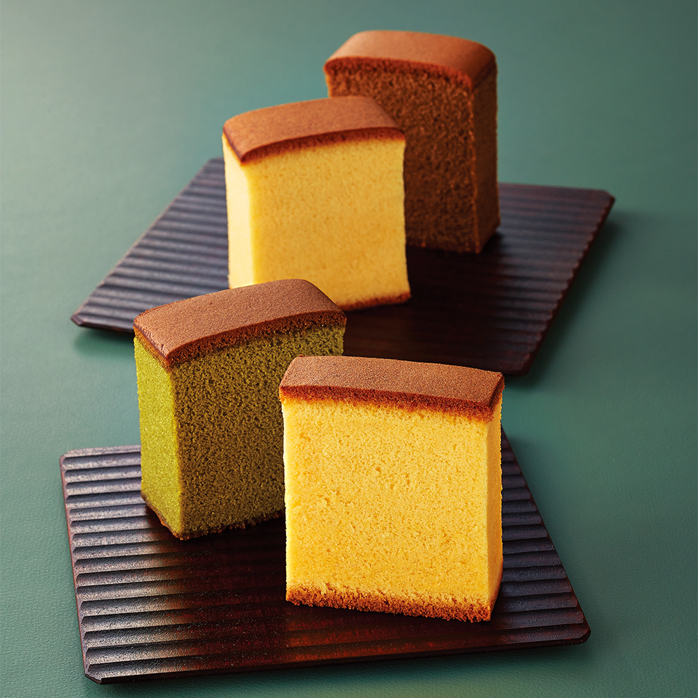烏骨鶏卵の味をいかし、しっとりした食感に仕上げたかすていら。檸檬、抹茶、金沢棒茶などを。