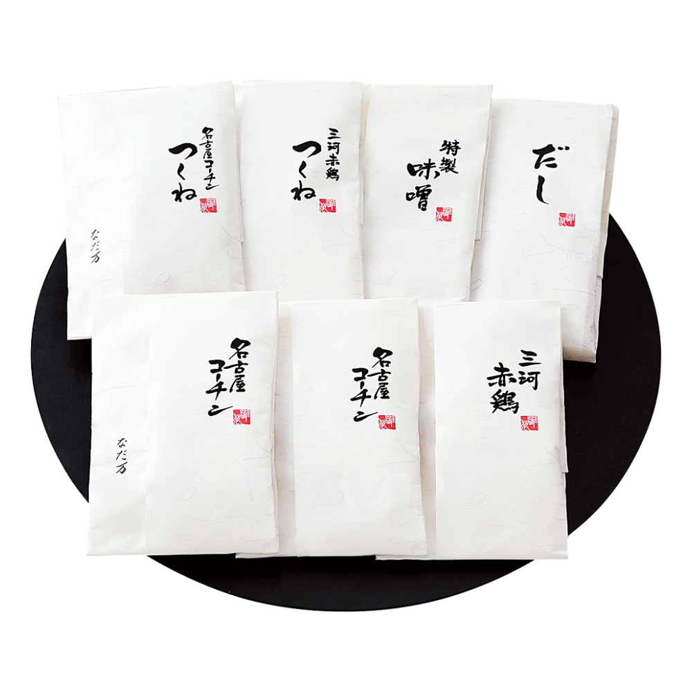 つくね(名古屋コーチン・三河赤鶏)各110g、名古屋コーチン鶏肉80g×2、三河赤鶏鶏肉80g、特製味噌(バター味噌)200g、なだ万だし360ml、3~4人前
