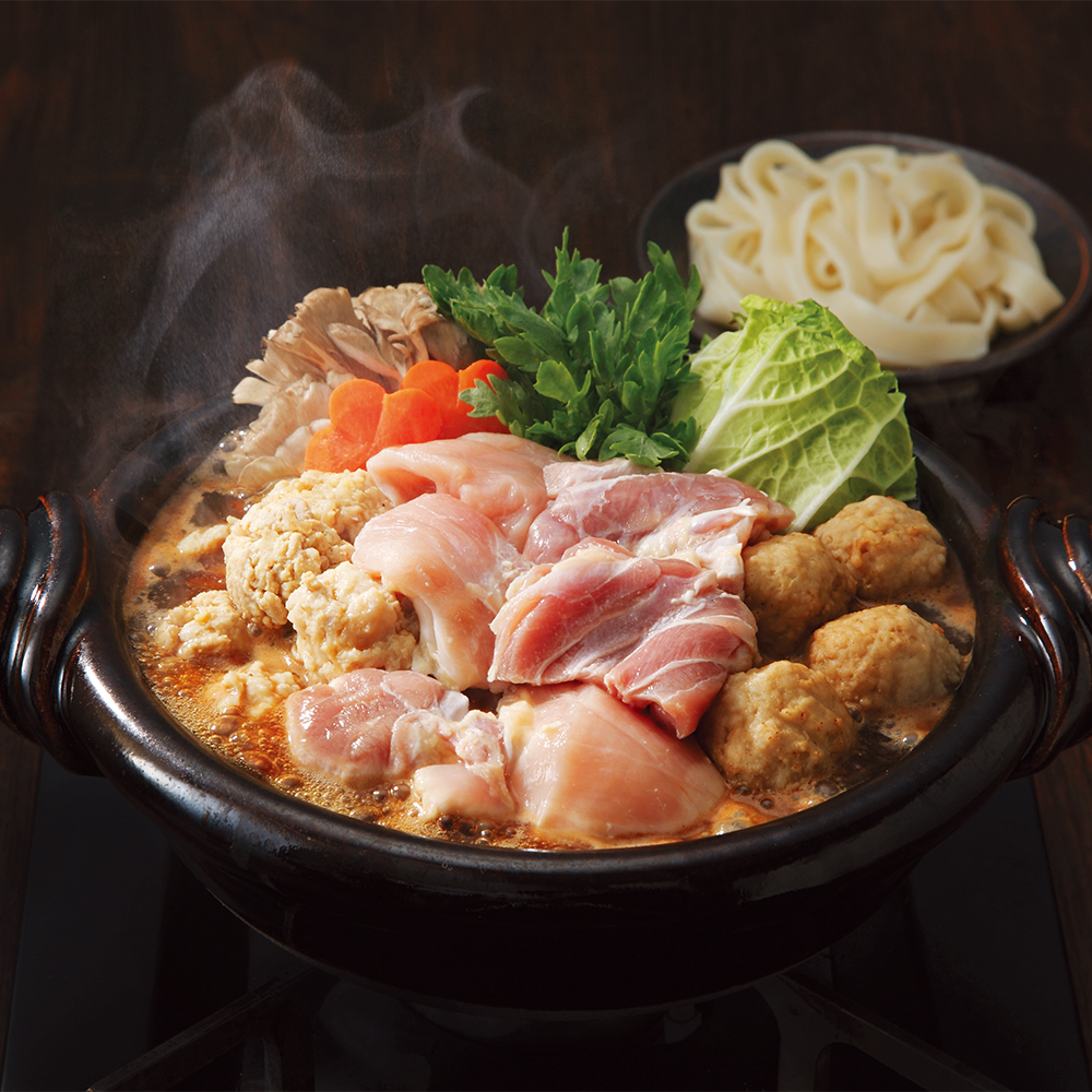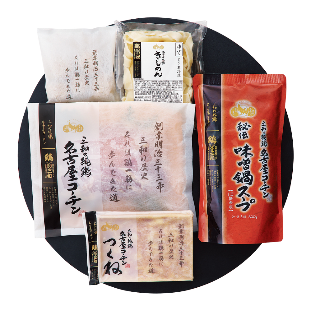 名古屋コーチン肉(もも・むね)計250g、名古屋コーチンつくね100g、名古屋コーチン入り団子(19g×8)、きしめん200g、味噌鍋スープ600g、2~3人前
