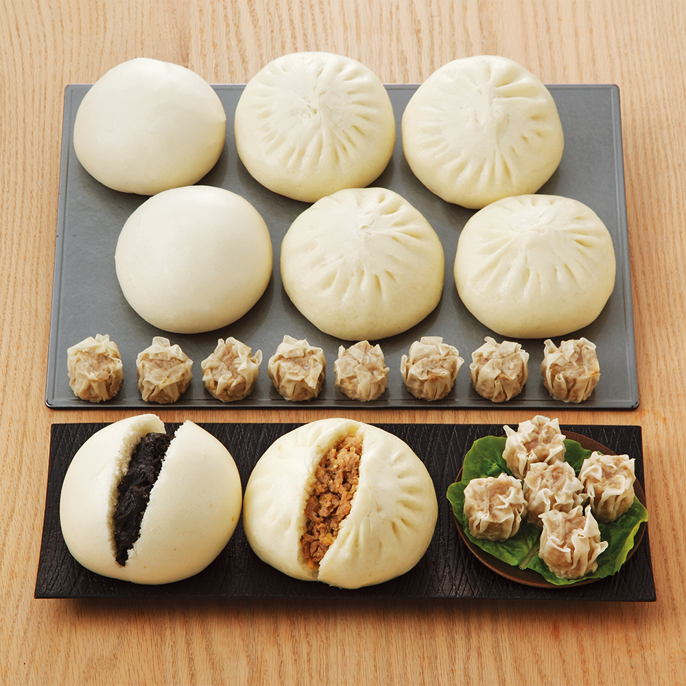 旨みあふれる肉まんと、自家製餡を包んだあんまん、貝柱の旨みが楽しめるシューマイを詰め合わせに。