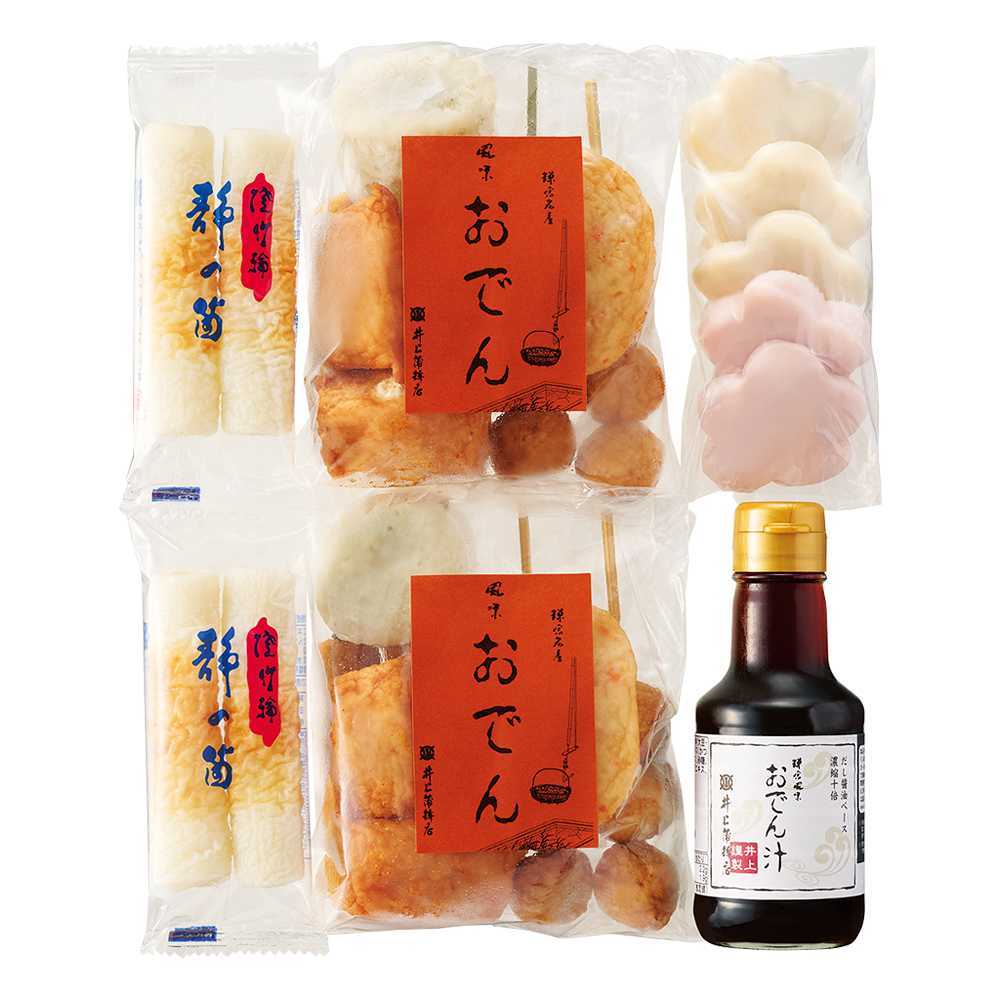 おでんの具:(小判揚・牛蒡巻・うずら巻・串ボール・つみれ各2)×2、静の笛(2本入)×2、梅花はんぺん×5枚、おでん汁