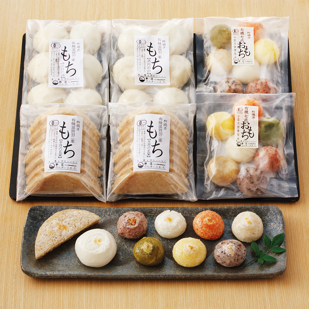 杵つき有機もち:満月の白250g・七色のおもち140g・半月の玄米260g各2 お届け時期:11月15日から