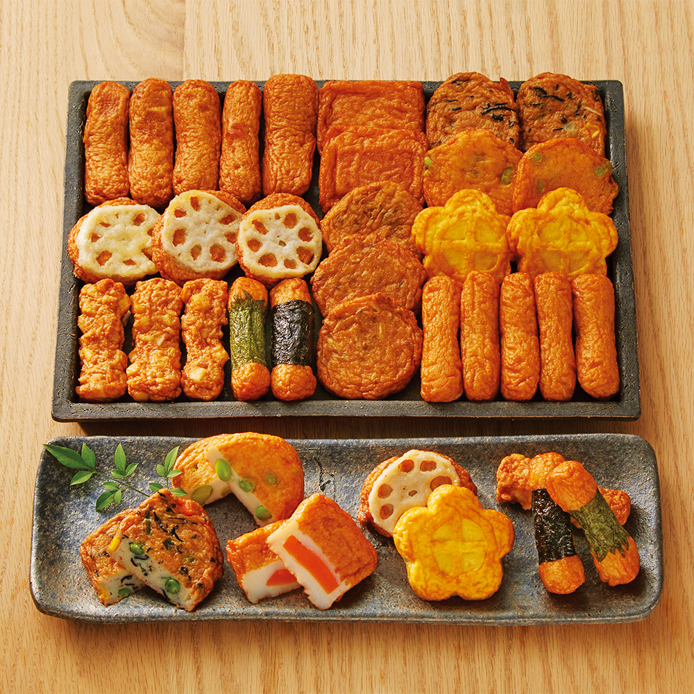 魚肉に鹿児島県産の地酒などを練り込み、菜種油で揚げたバラエティー豊かなさつま揚げのセット。