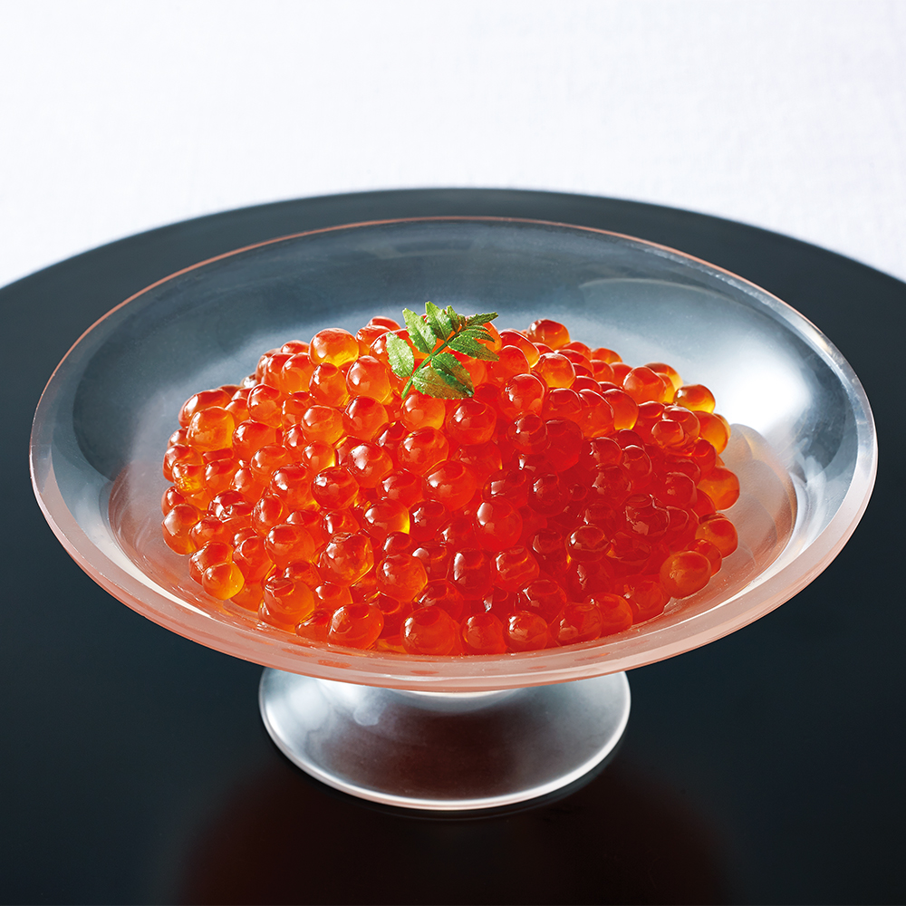 北海道で水揚げされた秋鮭の筋子を手でほぐし、保存料を使わず、酒、醤油、みりんのみで仕上げました。