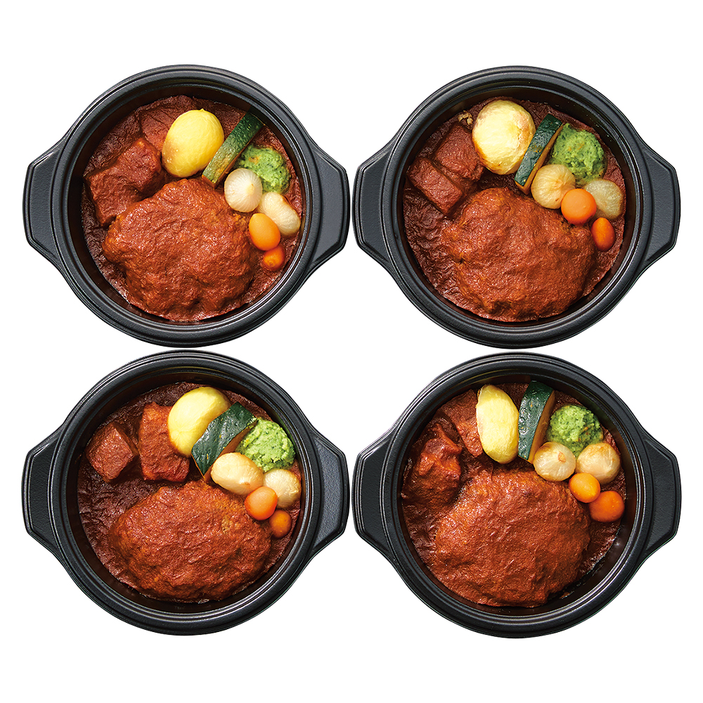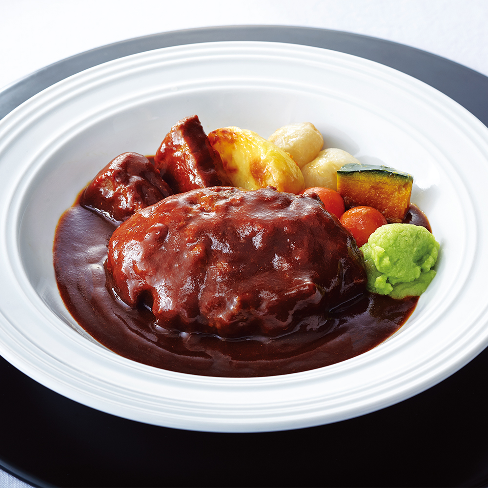 黒毛和牛100%の粗挽きハンバーグと、人形町今半の割下を隠し味に使用したビーフシチューを一緒に。