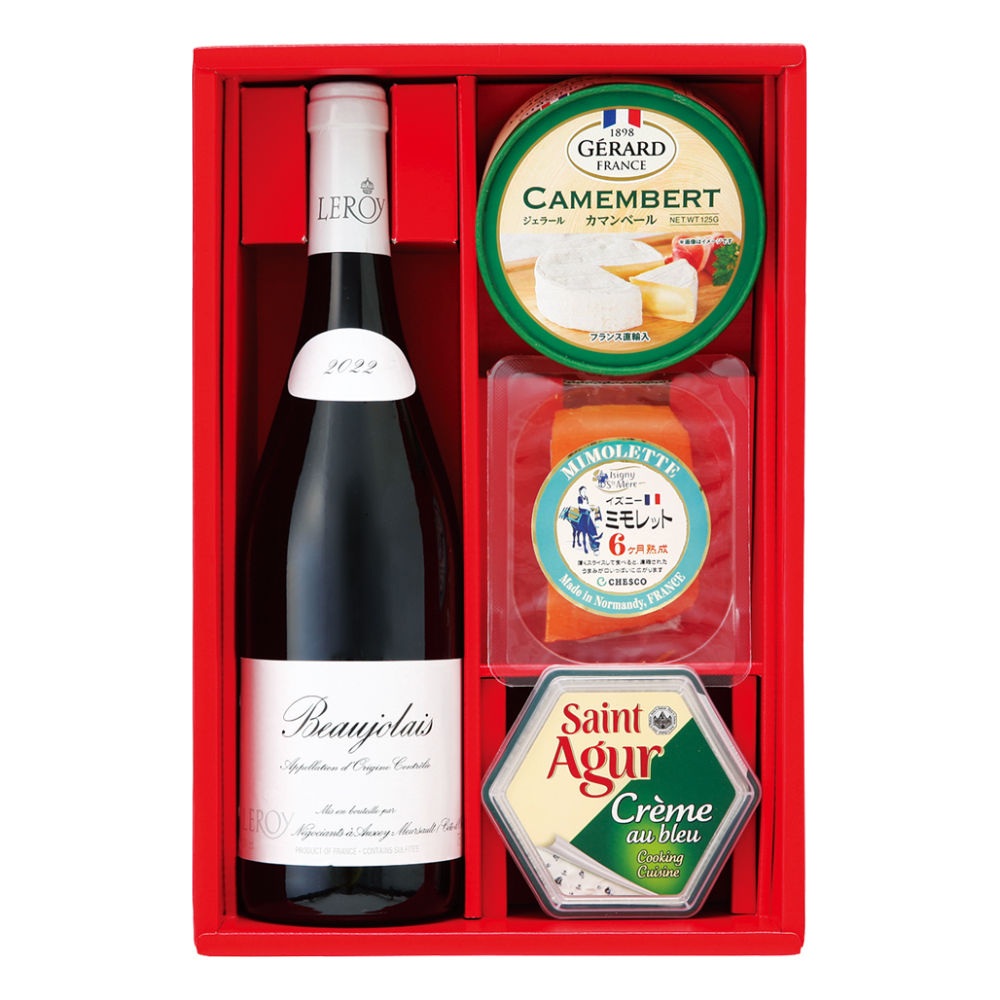 2022ボージョレ赤(ミディアムボディ)750ml、イズニーミモレット60g、ジェラールカマンベール125g、クレムドサンタギュール150g