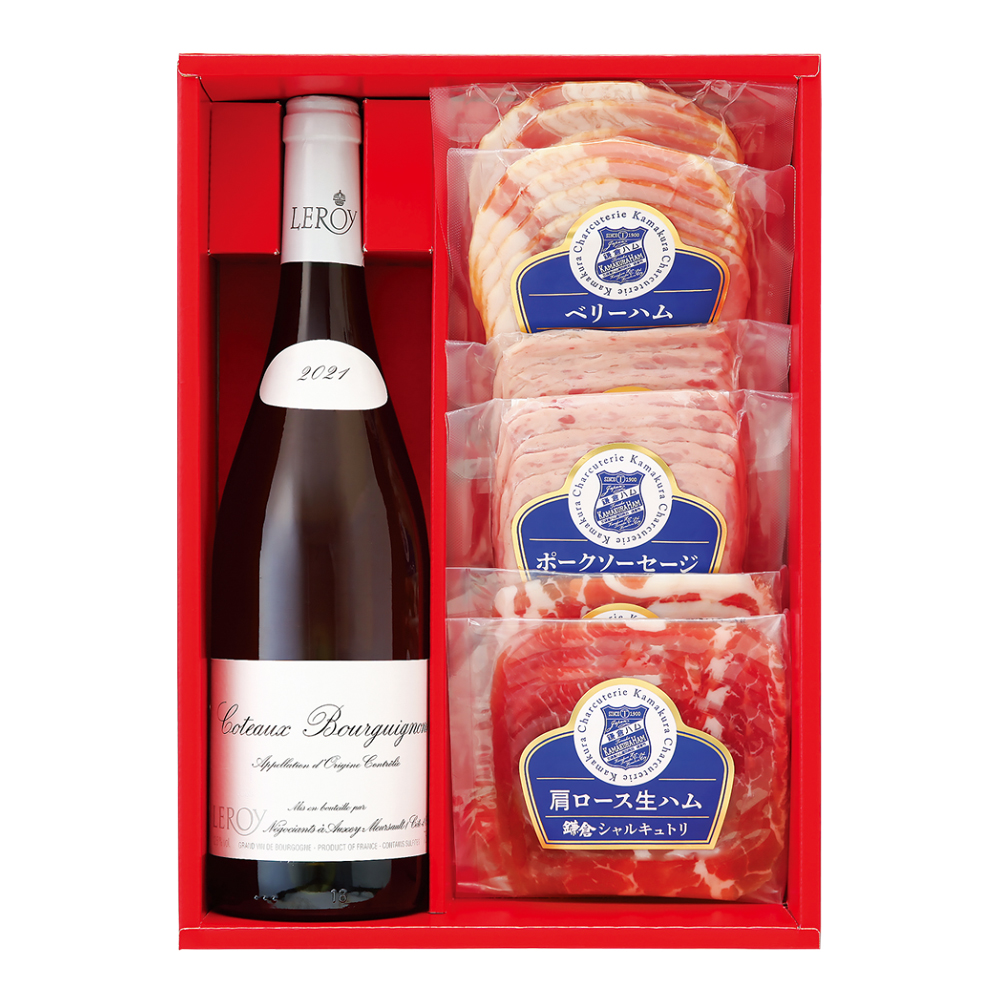 2021コトーブルギニヨン白(辛口)750ml、肩ロース生ハム50g×2、ポークソーセージ90g×2、ベリーハム72g×2