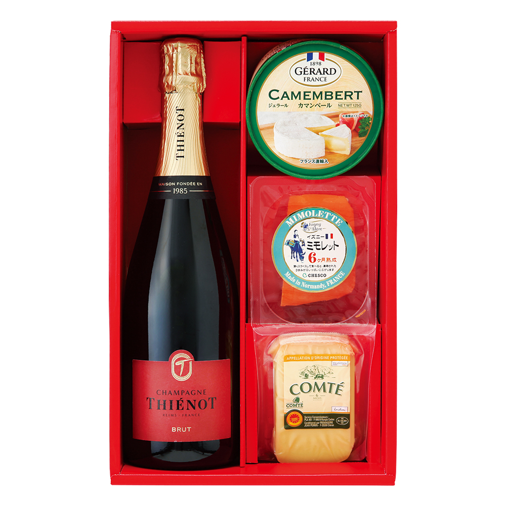 キュヴェブリュット白(辛口)750ml、ジェラールカマンベール125g、イズニーミモレット60g、コンテ100g